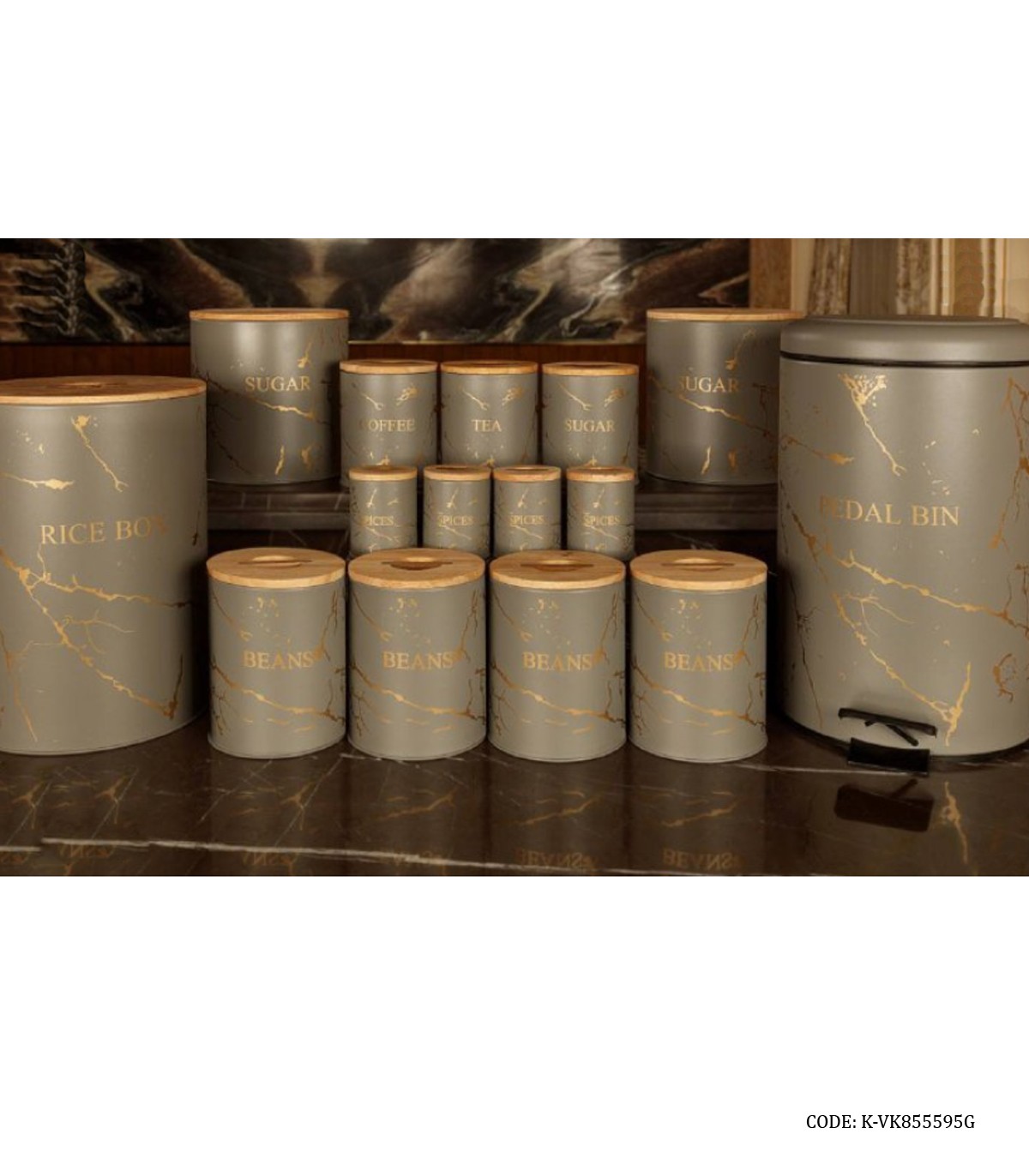 سرویس سطل برنج و قند و شکر درب چوبی ۳۰ تکه طوسی طلایی مدل MARBLE