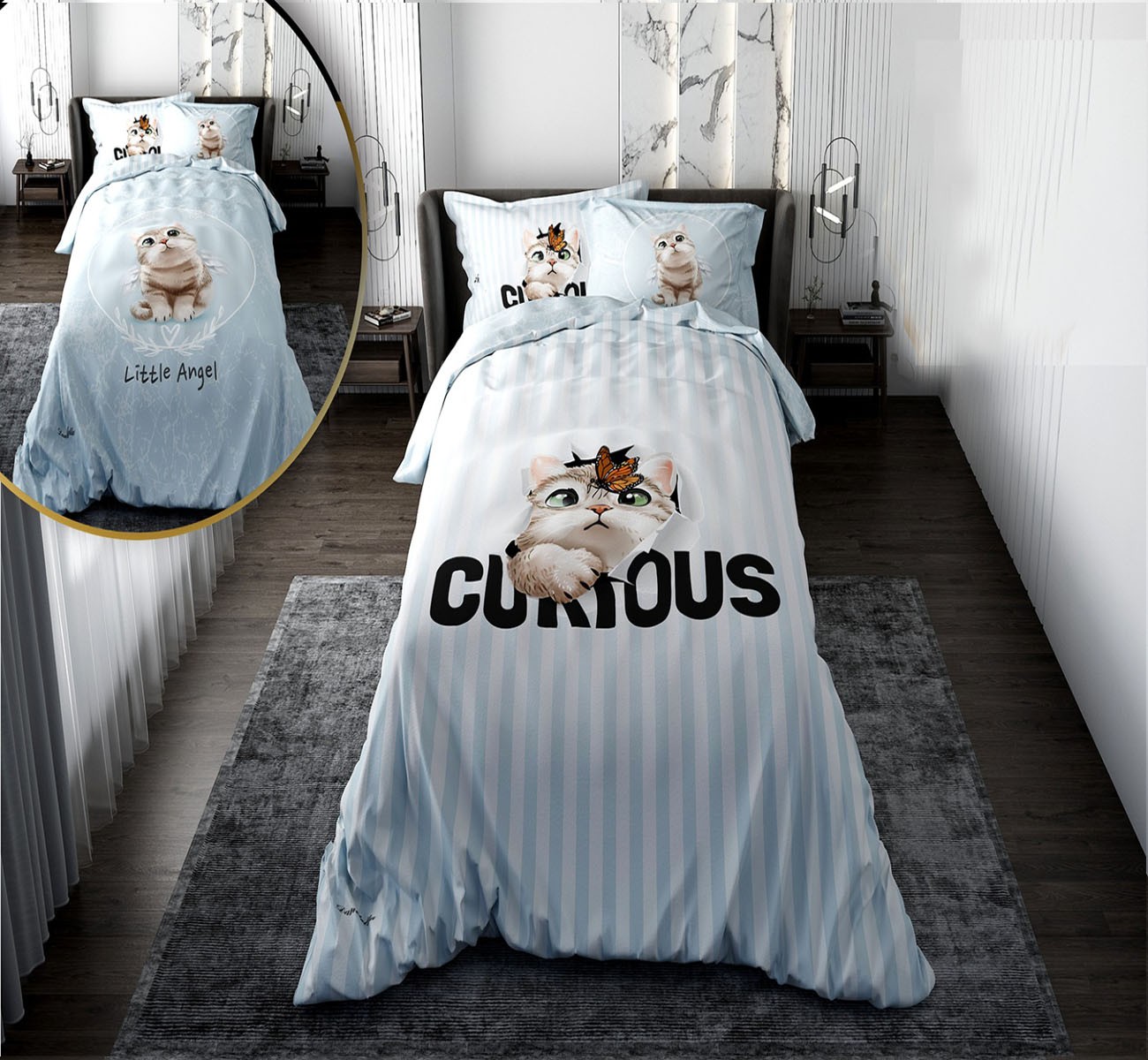 روتختی کودک دخترانه با لحاف دو رویه طرح گربه مدل Little Angle