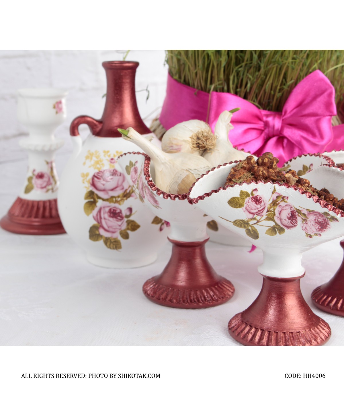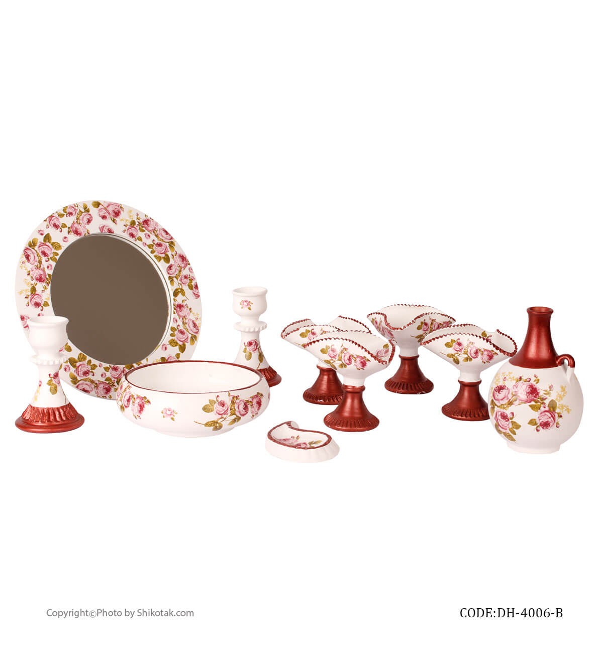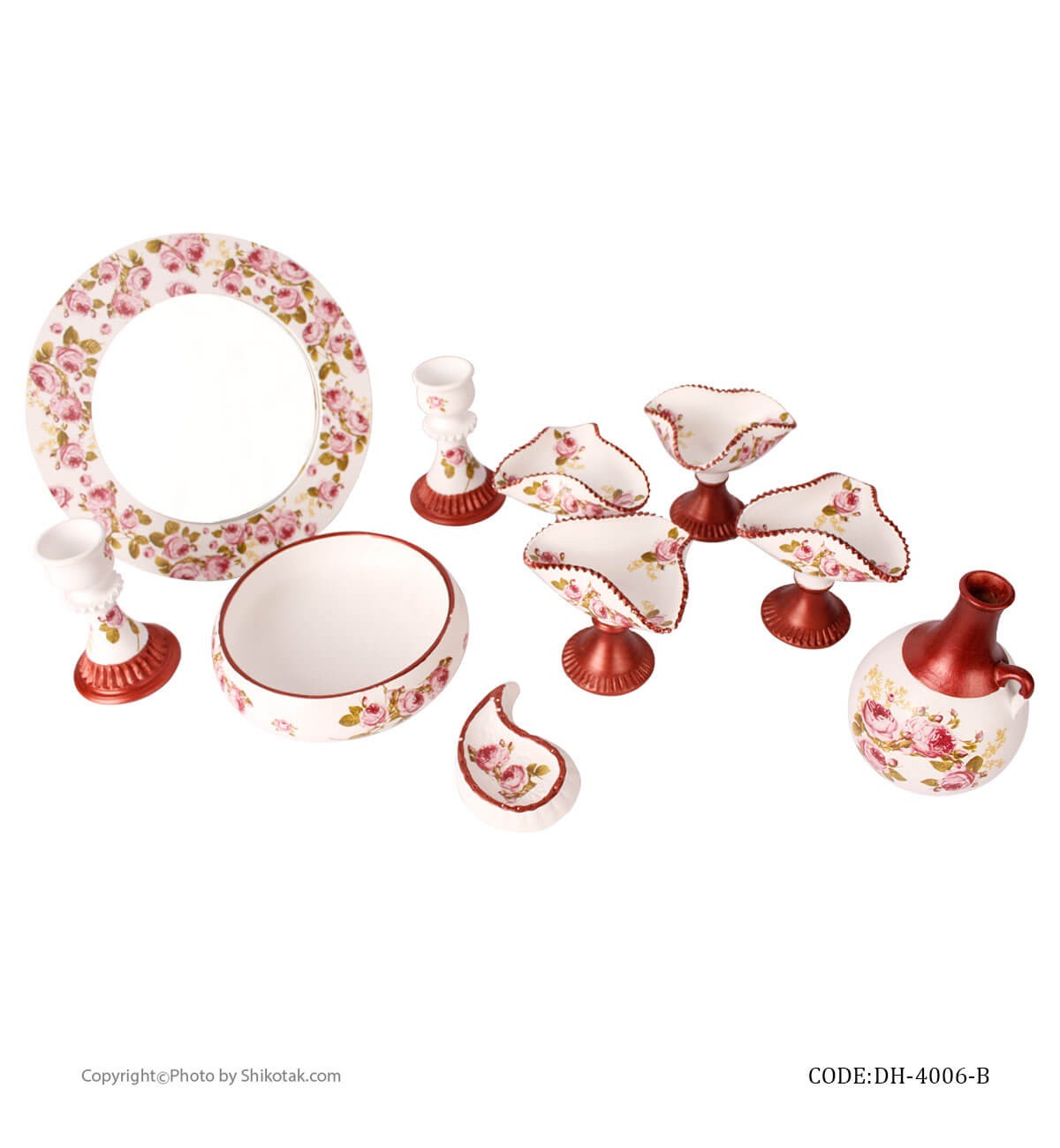 | شامل | 4عدد کاسه -یک عدد ظرف مخصوص سبزه -دو عدد شمعدان- یک کوزه کوچک مخصوص سرکه و یک عدد ظرف اشکی مخصوص سکه |