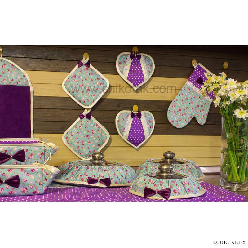 | شامل | 18 تکه: 1 عدد نمگیر ظرف،1 عدد پیش بند،3 عدد دمکنی کش دار،2 عدد دستکش فر،2 عدد دستگیره قلبی، 2 عدد دستگیره مربع،1 عددکیسه نان، 1 عدد جانونی رومیزی، 1 عدد کیسه سبزی، 1 عدد جاسبزی رومیزی، 1 عدد حوله، 2 ع |