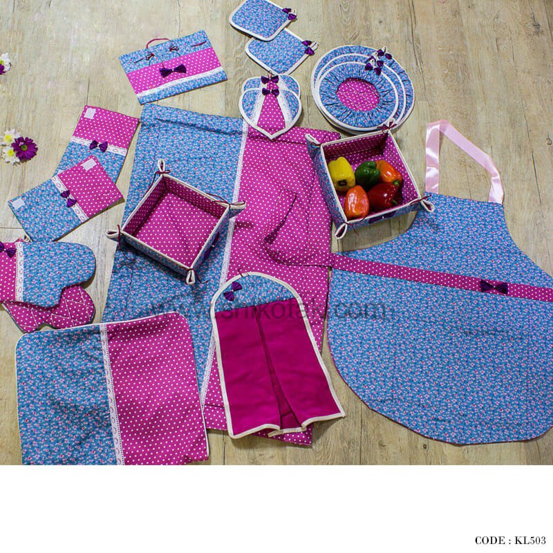| شامل | 18 تکه: 1 عدد نمگیر ظرف،1 عدد پیش بند،3 عدد دمکنی کش دار،2 عدد دستکش فر،2 عدد دستگیره قلبی، 2 عدد دستگیره مربع،1 عددکیسه نان، 1 عدد جانونی رومیزی، 1 عدد کیسه سبزی، 1 عدد جاسبزی رومیزی، 1 عدد حوله، 2 ع |