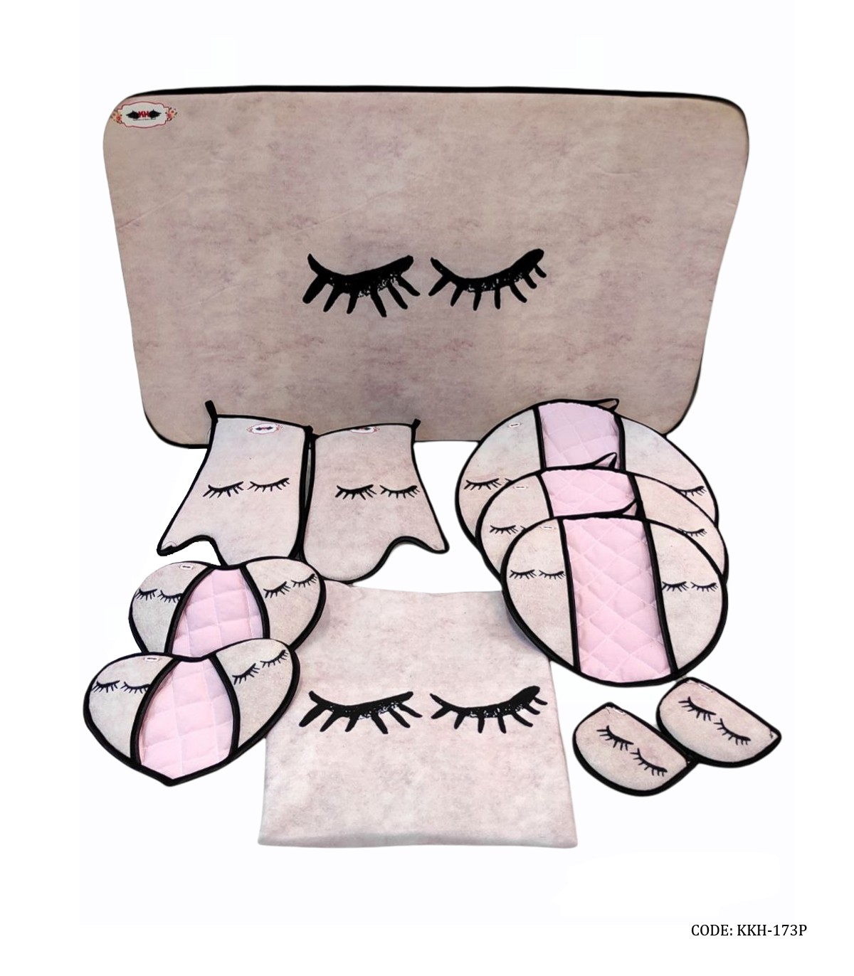 - شامل: دم کنی گرد سه عددی، دستگیره قلبی دو عدد، پیشبند، دو عدد دستگیره مربعی، یک عدد نمگیر ظروف، دو عدد دستکش فر