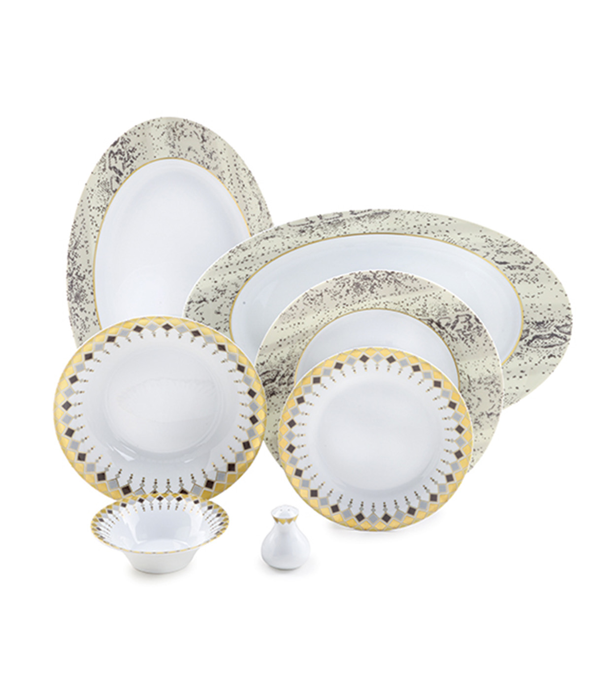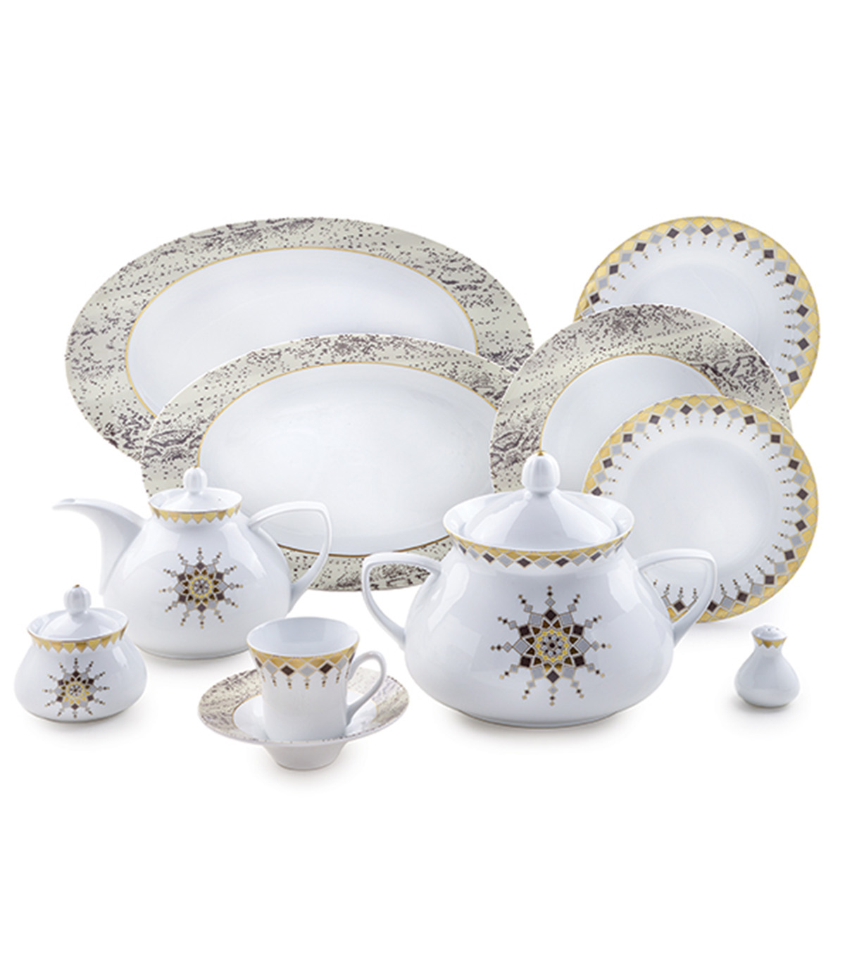| شامل | 12پلوخوری، 12خورش خوری، 18میوه خوری، 2دیس بیضی کوچک، 1دیس بیضی بزرگ، 12پیاله کوچک، 6پیاله بزرگ، 3کاسه آبگوشت خوری، 2سالاد خوری، 12فنجان، 12نعلبکی، 1سوپ خوری با درپوش، 6نمک پاش، 1قوری با درپوش، 1قندان |