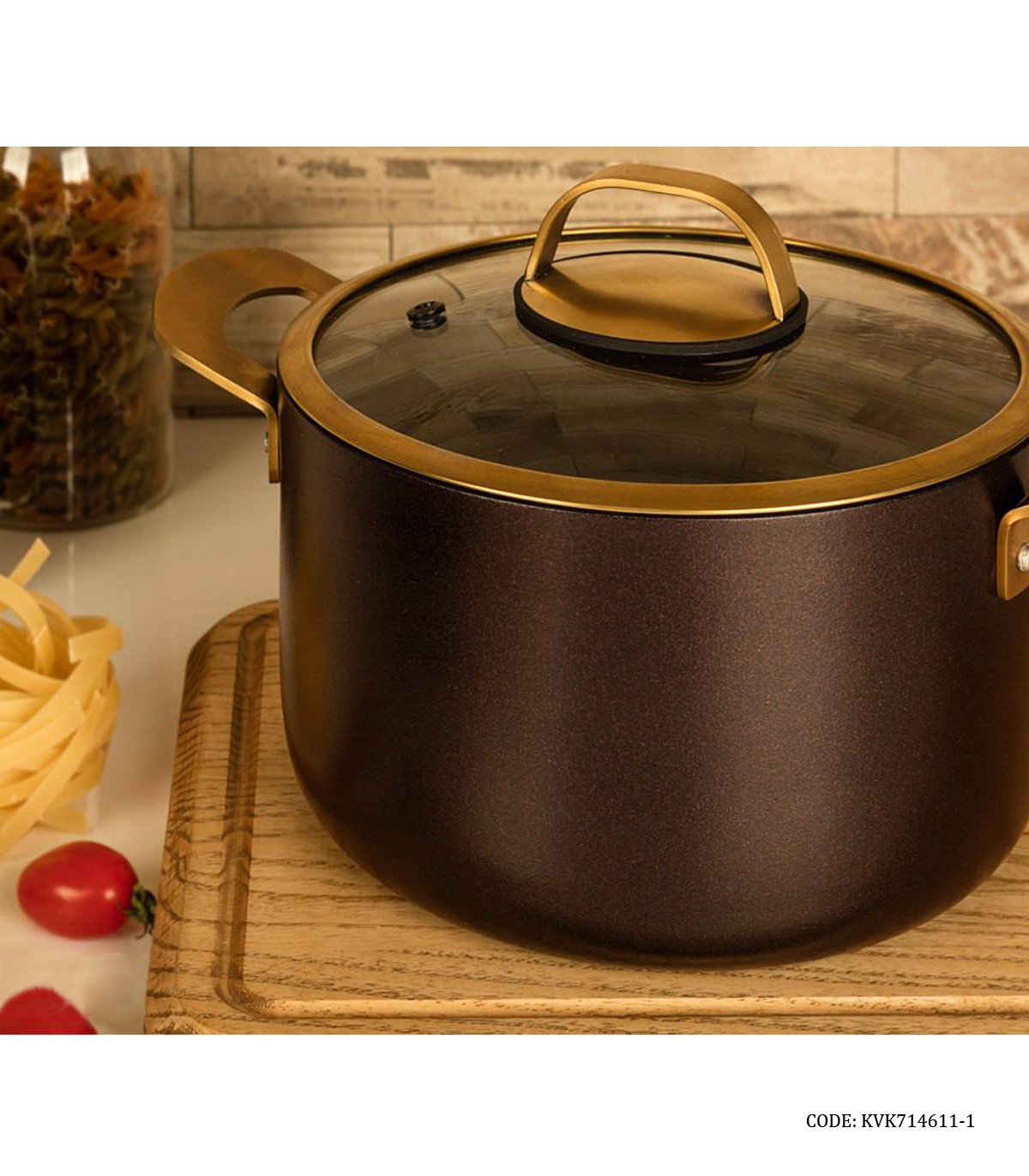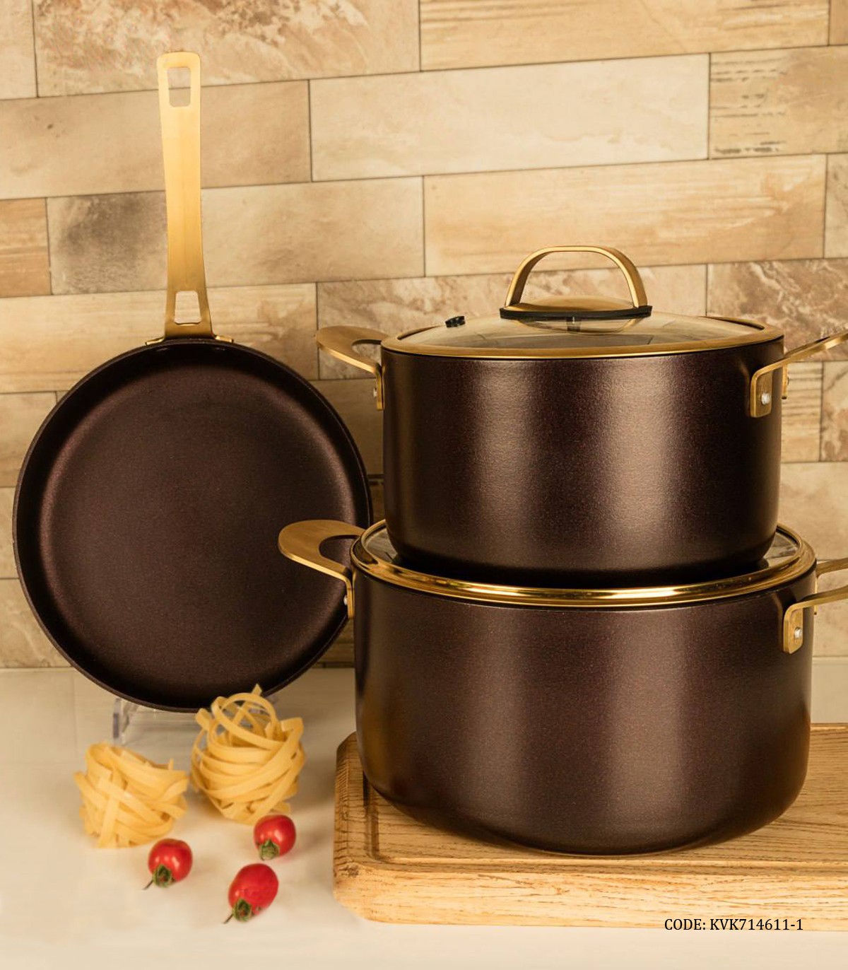 سرویس قابلمه گرانیتی ۱۱ پارچه ویراکیش قهوه ای دسته طلایی مدل سورنا