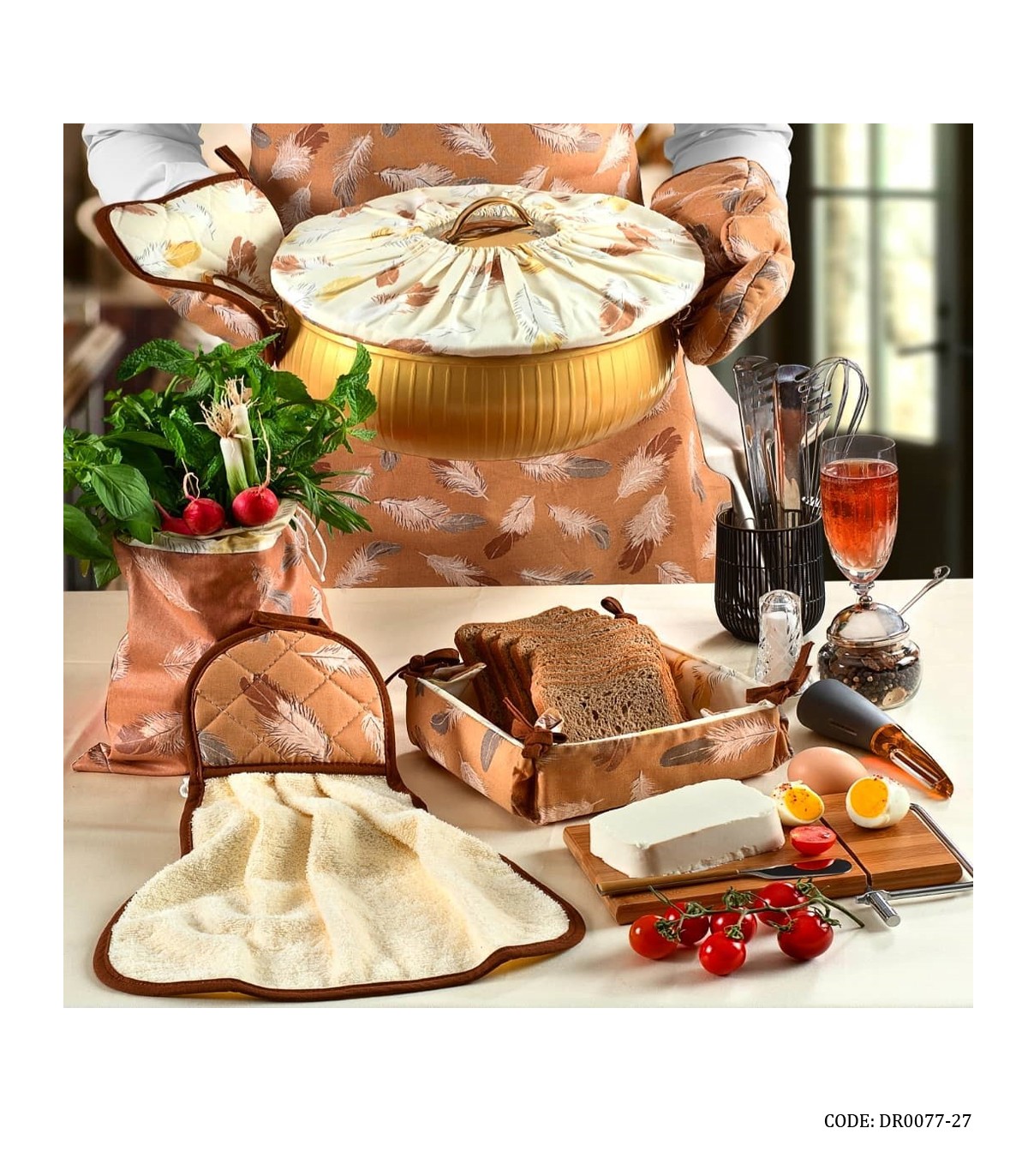 • شامل: دم کنی سه عدد ، دستگیره دو عدد، دستکش فر دو عدد، دستمال سفره چهار عدد، پیشبند، روقوری، حوله آشپزخانه، کیسه سبزی سه عدد، دستگیره یخچال دو عدد، سبد نان، زیربشقابی دو عدد
