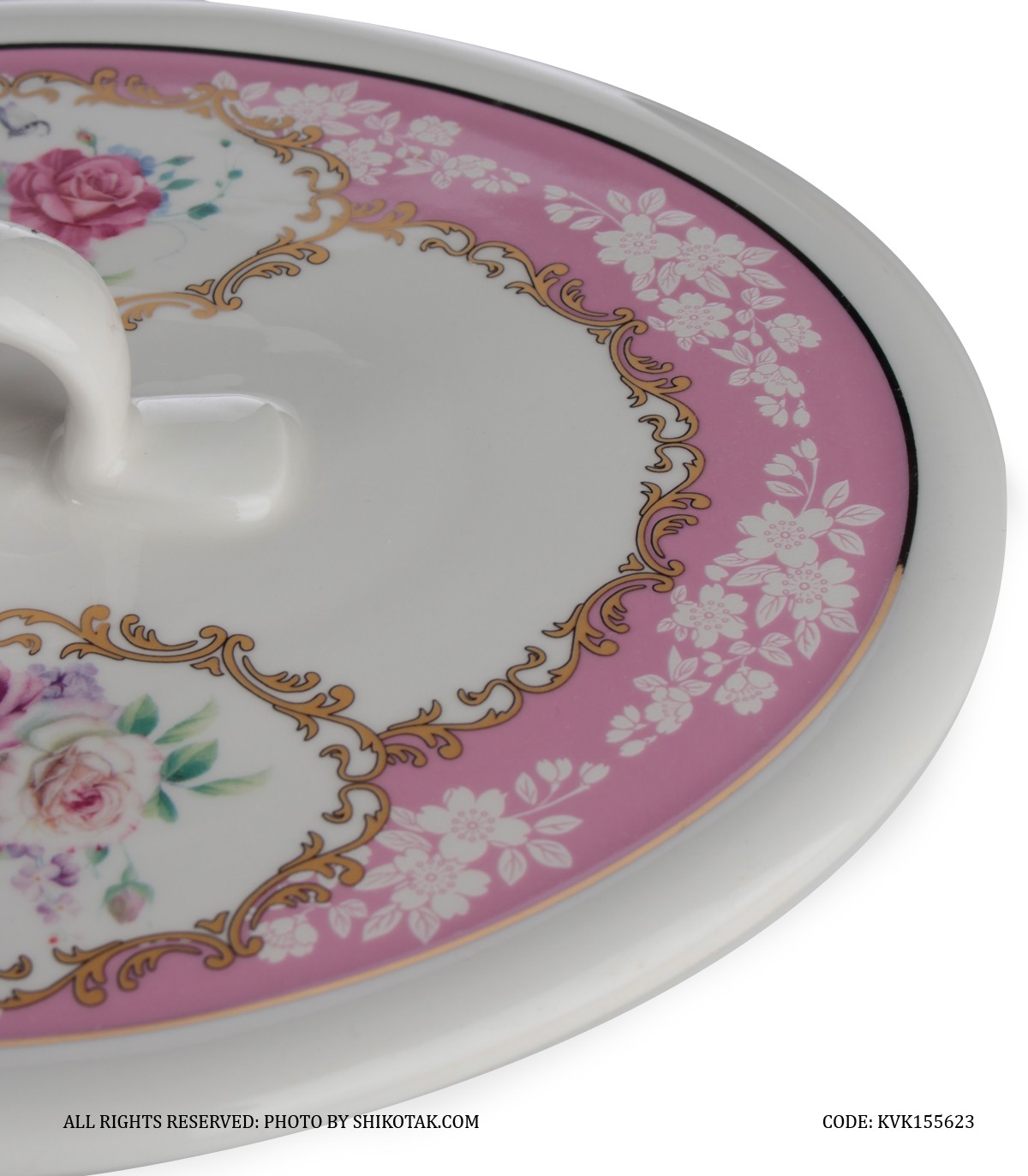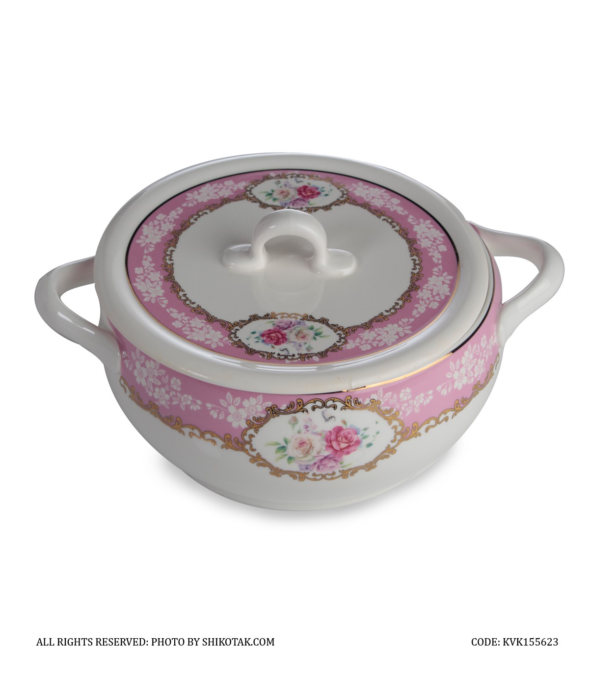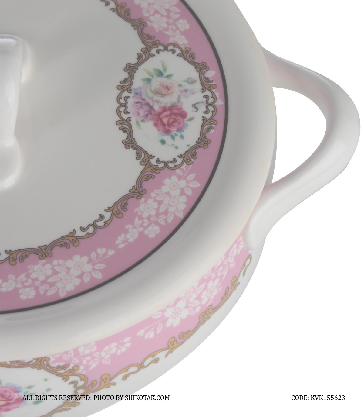 ظرف سوپ گل سرخی نمونه ای از سوپ خوری شیک به حساب می آید . گل های زیبای سرخ روی بدنه این سوپ خوری به همراه نقوش زیبای طلای طبیعی ترکیبی زیبا و جذاب را خلق کرده است .