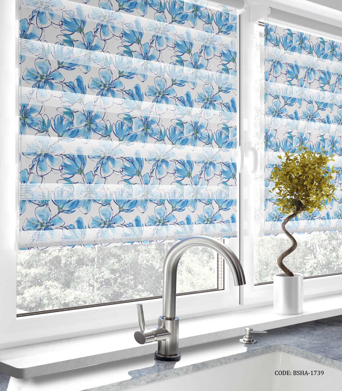 پرده زبرا آشپزخانه طرح گل های آبی