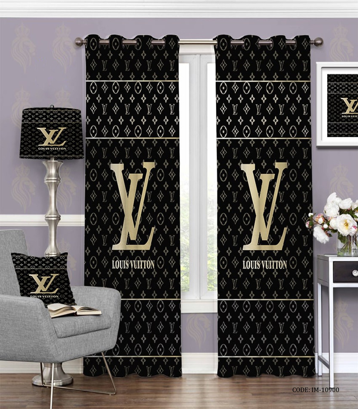 پرده پانچی اسپرت اتاق خواب مشکی طلایی طرح برند لویی ویتون