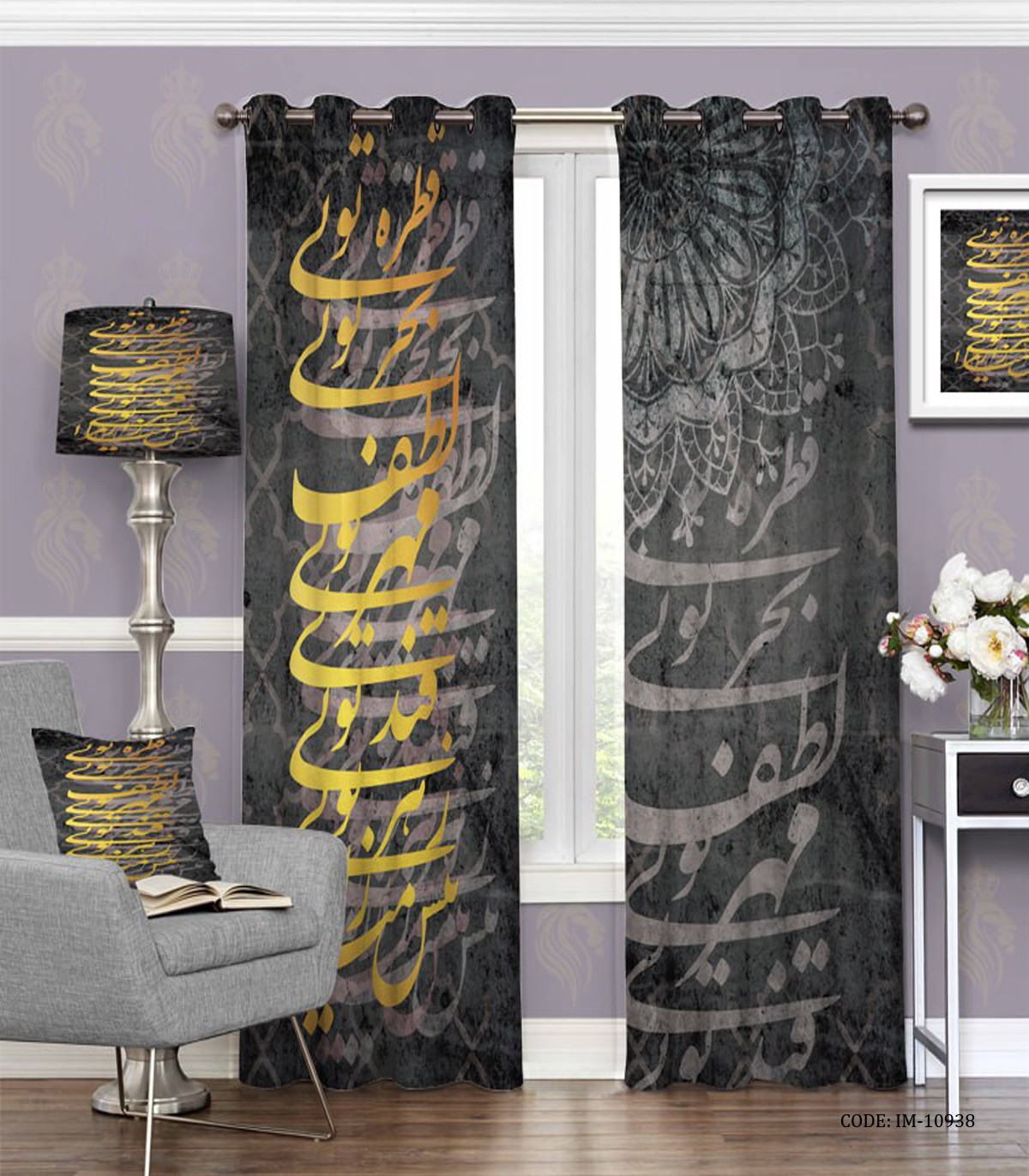 پرده پانچی طوسی زرد طرح خوشنویسی مدل قطره تویی بحر تویی