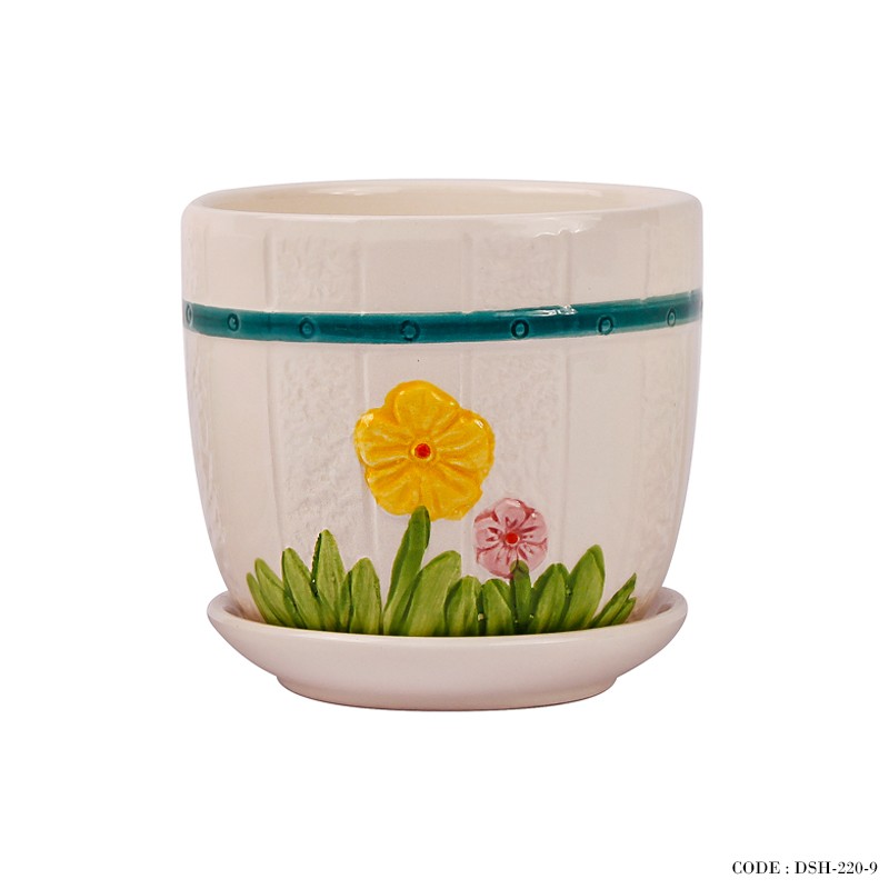 گلدان و زیر گلدانی سرامیکی طرح گل زرد
